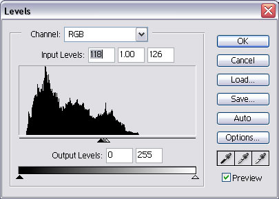 With the new layer selected in the Layer Palette, bring up the Levels Menu ( Ctrl-L or Image > Adjustments > Levels... ). Use around the settings shown in the image above.